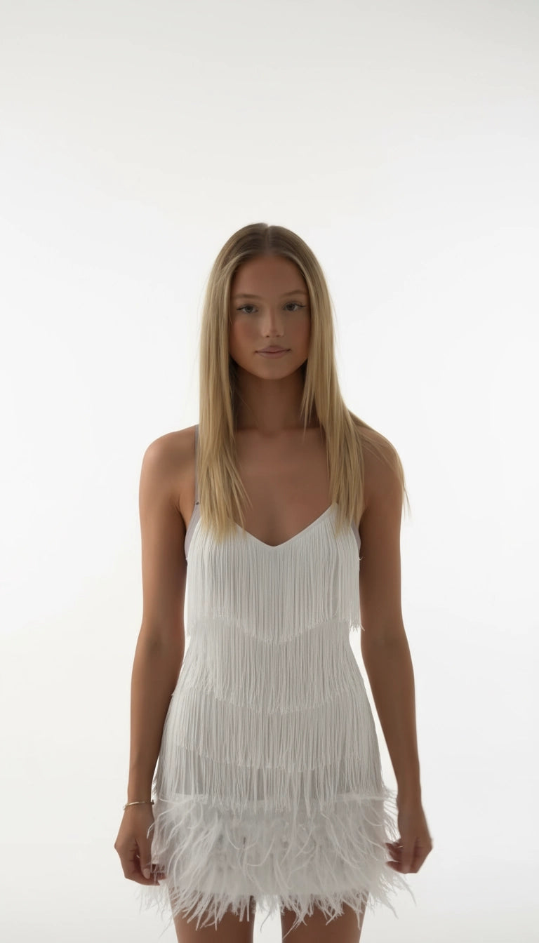 Met de Élora jurk straal je pure luxe en elegantie uit. De speelse veren zorgen voor een unieke, high-fashion uitstraling, terwijl het korte silhouet je look een flirty en verfijnde touch geeft. Perfect voor feestjes, gala’s en speciale gelegenheden waar je wilt opvallen.