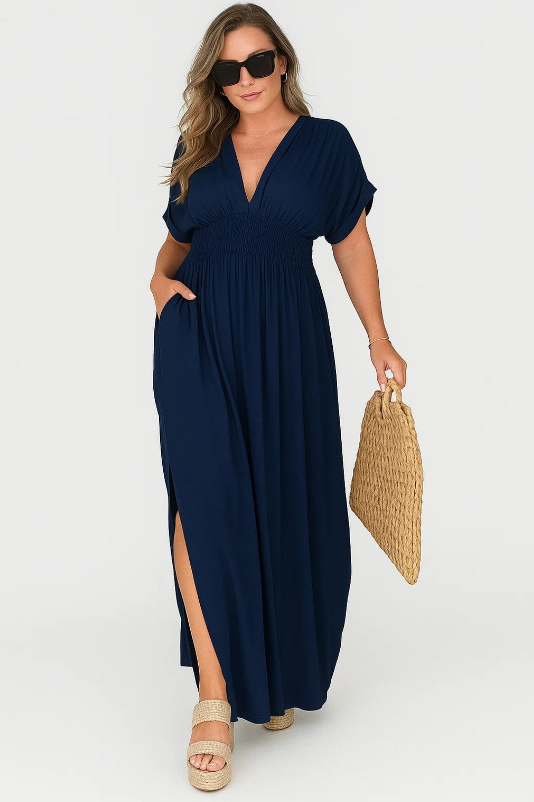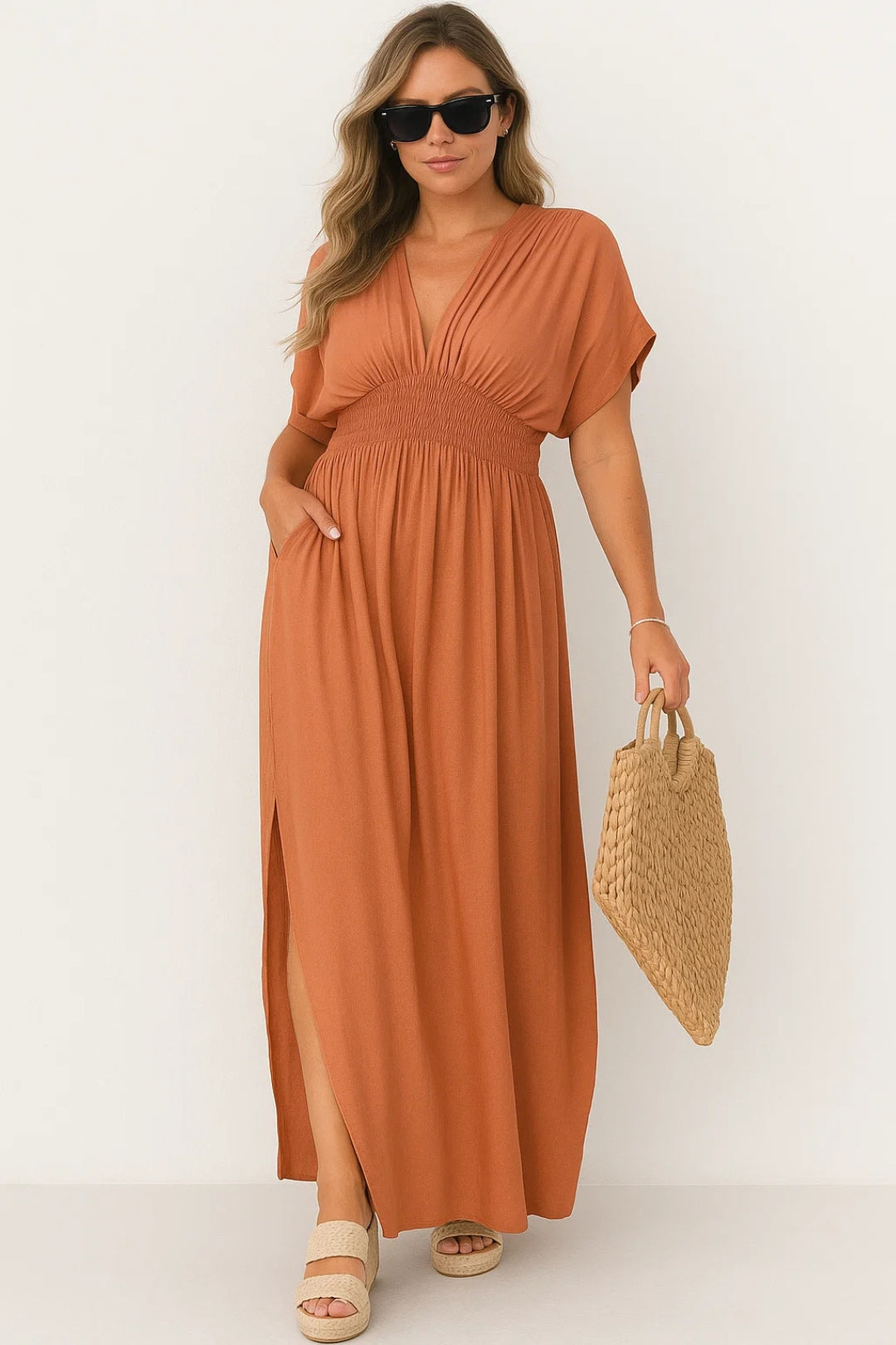 Deze lange jurk met V-hals flatteert elke lichaamsvorm dankzij de vloeiende snit en de elastische tailleband. De zachte mouwen en de split aan de zijkant zorgen voor extra comfort en beweging. Ideaal voor stadswandelingen, zomerse aperitieven of avonden aan zee.