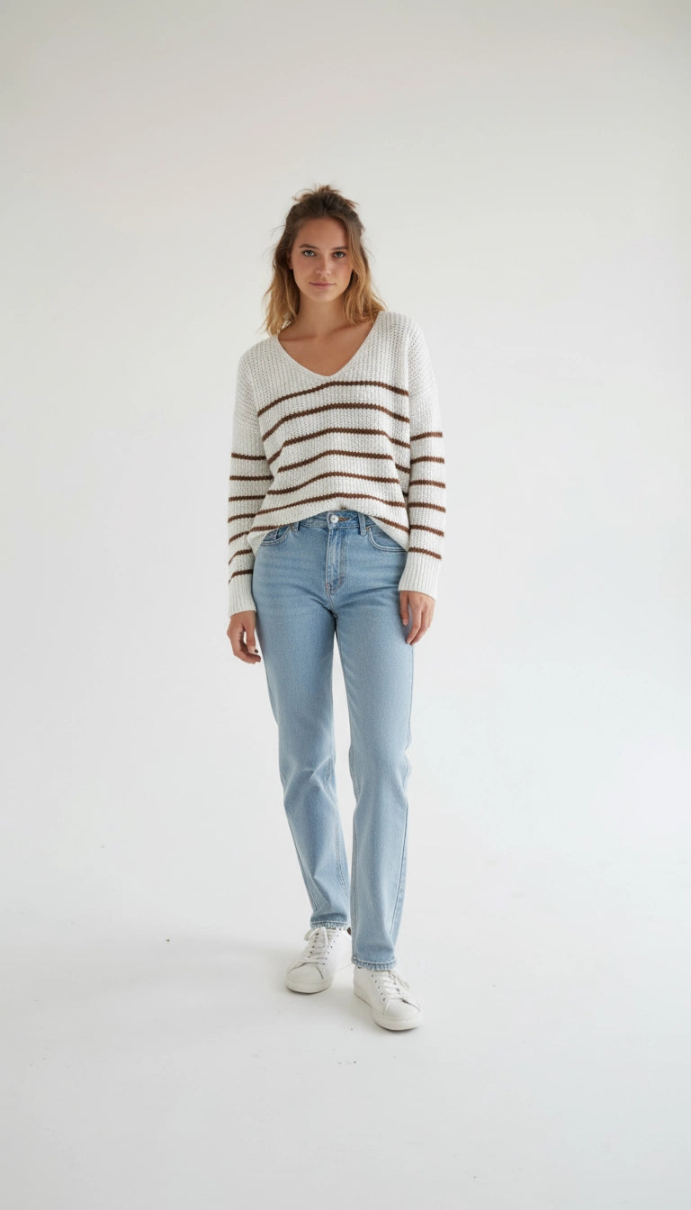 Maak kennis met de Luna - Gestreepte V-Hals Trui voor de Trendy Vrouw, jouw nieuwe favoriete kledingstuk! Deze trui met een charmant gestreept patroon en een elegante V-hals verleent iedere outfit een frisse en trendy uitstraling. Of je nu een dagje uit plant of een casual dagelijkse look wilt creëren, deze trui is de ideale keuze om jouw stijl naar een hoger niveau te tillen.